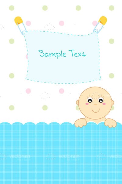 Check out this adorable vector graphic design with baby theme! It features an abstract smiling baby sneaking out of his blue crib with grid pattern and wavy border. Design includes a pastel dots pattern background with a blue sheet with sample text on it, held to the background by two safety pins. A design ideal for baby announcement themes, cards, invitations, and more. Get it for free in .EPS format right now!