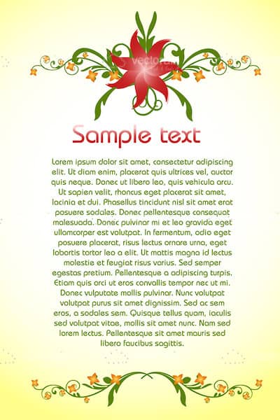 Add a touch of classic elegance to your copy with this lovely vector background with floral ornaments. Including plenty of sample text in the center of a gradient yellow to white backdrop, that includes red header fonts and green content text, this background frames text with a main floral ornament with a big red flower and green and orange leaves and curves at top, and a simpler green floral pattern at the bottom. A great way to enhance the visual appeal of large chunks of text, that works well for web pages, presentations, cards, invitations, posters, decorations and more. Get this free .EPS file only at VectorJunky!