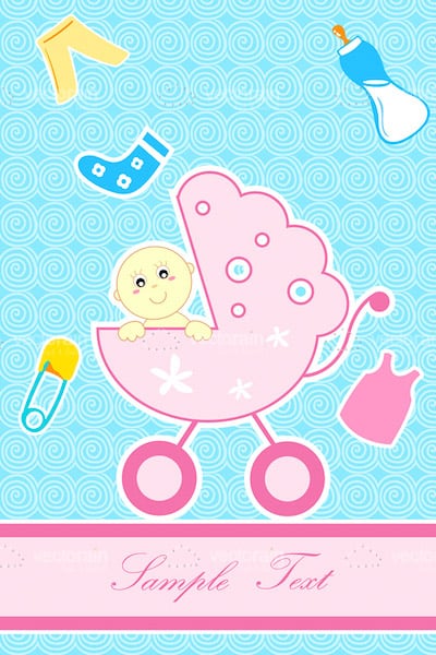 Cute Baby Girl in Pink Pram with Baby Elements and Sample Text