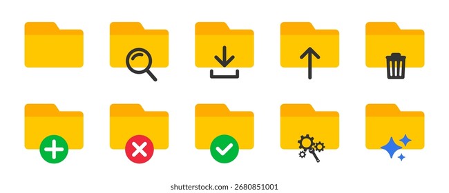 Check out this cool vector icon set with nine different version of an abstract green folder, each with a different graphic or symbol in blue. They include a magnifying glass, arrows pointing up and down, an earth globe, a recycle symbol, an infinite arrow circle, a cross, a tick mark and a star. Ideal to use in any design for websites, apps, interfaces, and more. Download the whole set for free in .EPS format and use it however you want.