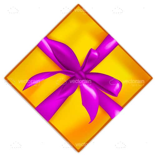 Beautiful vector illustration of a rhomboid shaped gift box in shiny gold wrapping, with a glowing purple ribbon with bow decorating it. Isolated on white, this graphic is a good complement for your website, adverts, flyers, banners, etc. Download it for free in .EPS format right here.