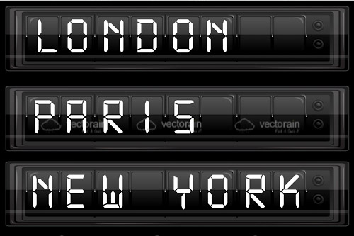 Check out this awesome display board! With a Train Station or Airport style, this international display is showing the countries London, Paris and New York in a stylised digital text! Coming in black and white, this cool display board would look awesome on so many designs including websites, menus, cards, logos, icons and so much more! Grab it now, exclusively from VectorJunky and Totally Free to use however you like, wherever you like!