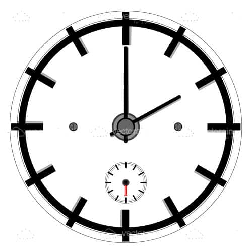 A timeless vector illustration showing a minimalist styled clock, designed in black and white with simple lines for minute marks, a pair of clock needles and including a second counter with red detail. A versatile graphic that works for all kind of projects, suitable for web pages, ads, banners, cards, posters, etc. Get it for free in .EPS format and use it right away!
