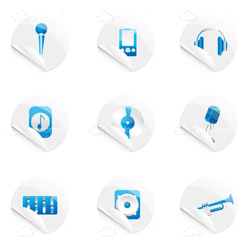 This cool vector icon set represents various music related items. All designed as round glossy stickers with unfolding edge, icons are blue on white background and there's nine of them: a microphone, a portable music player, headphones, a rectangle with a musical note, a CD, an HD microphone, a sound console, a speaker and a trumpet. Get this set for free in .EPS format and use these stickers in your music themed designs!