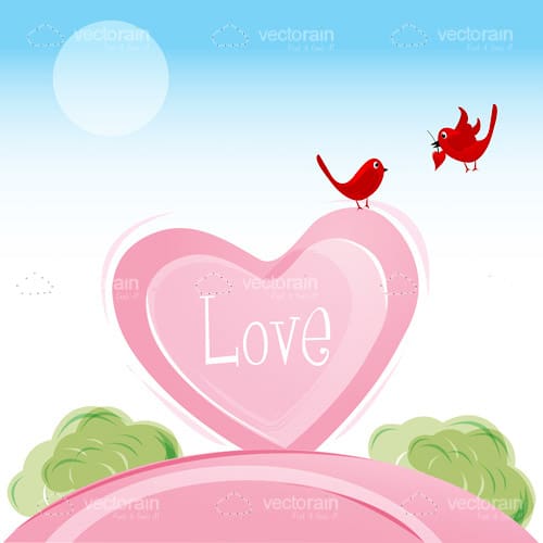 Lovely vector illustration in abstract style for romance and love topics! It shows an outdoor scene with blue sky and green trees, including a pink slope with an equally pink heart with irregular shape and matching tone border, adding the word "love" in white inside. All with glossy effect, design includes two abstract red birdies, one sitting on the heart and the other flying to it. A lovely concept for a card, a poster, a decoration, among other options. Download the .EPS file for free and use it in any way you want!