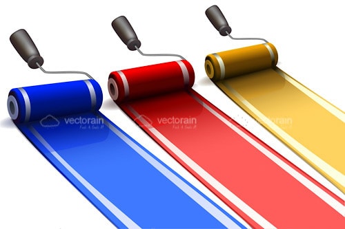 Interesting vector illustration featuring three paint rollers leaving a trace of glossy paint in straight, parallel lines in blue, red and yellow respectively, on a white background. A simple design with lots of possible uses to add colour and a fun element to your projects. Download it for free in .EPS format and use it however you like.