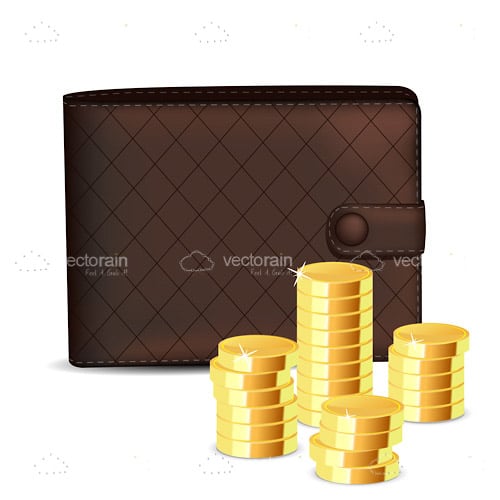Professionally crafter vector illustration with money and finances concept. It features a brown wallet with geometric pattern next to four piles of golden coins, all isolated on white. Easy to customise in .EPS format, this element is a good fit for any project related with money, currency, finances, economy, etc. Get the free .EPS file here on VectorJunky.