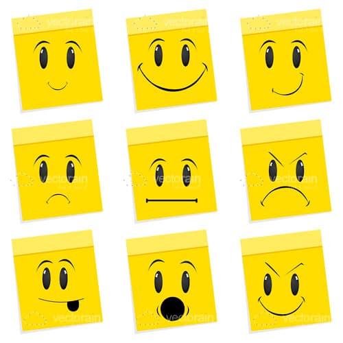 Fun vector graphic design with a set of nine post its designed as yellow inclined squares, each with an abstract emoticon representing a different emotion or facial expression in black lines. Download them all for free in .EPS format and use them to add a bit of fun and emotions to your designs!